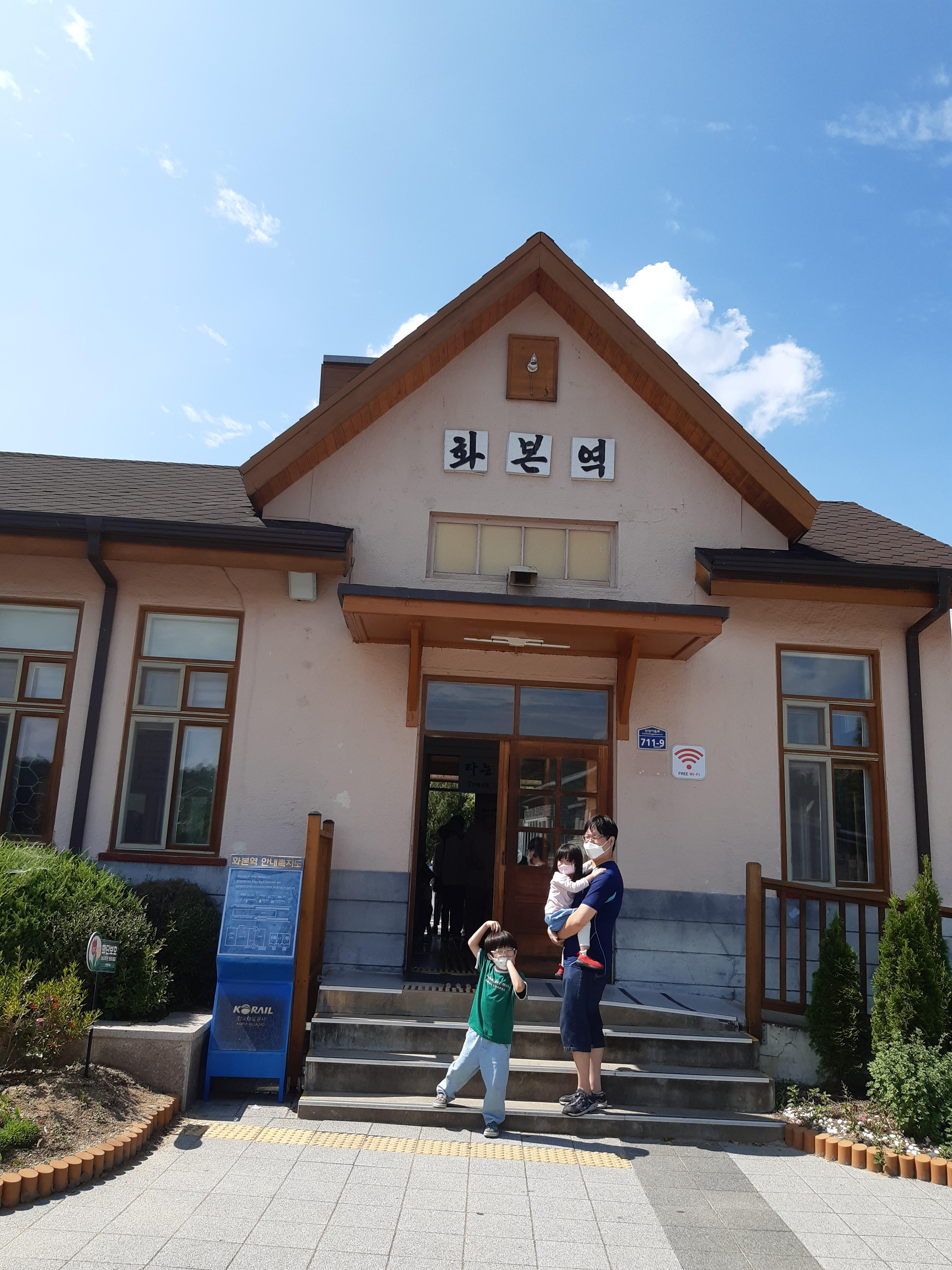 군위체험여행 예약을 하고 9월 중순, 생전 처음으로 군위군에 발을 디뎠다. 오전 오후 프로그램을 나눠서 진행하는데 기대 만발:) 화본역 주차장에 주차하고(철덕인 봄이가 역으로 달려가려는 걸 애써 붙잡으며) 화본마을 체험 시작! 폐교를 리모델링해서 '엄마아빠 어렸을 적에'라는 이름으로 운동장 주변을 에어바운스, 꼬마기차, 3-4륜 자전거, 마당놀이로 꾸며두었다.